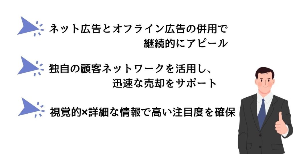 インターネット広告、SNS、業界紙、そして独自の顧客ネットワークを活用した多角的なアプローチで、幅広く買い手にアピール〇