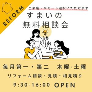 お住いのリフォームについてご相談ください◎ すまいの無料相談会開催します 7/4~6 9:30~16:00(開始) リフォームの事が知りたい、他業者様との相見積りをとりたい…相談だけしてみたい お悩みのアナタ、今回の無料 […]